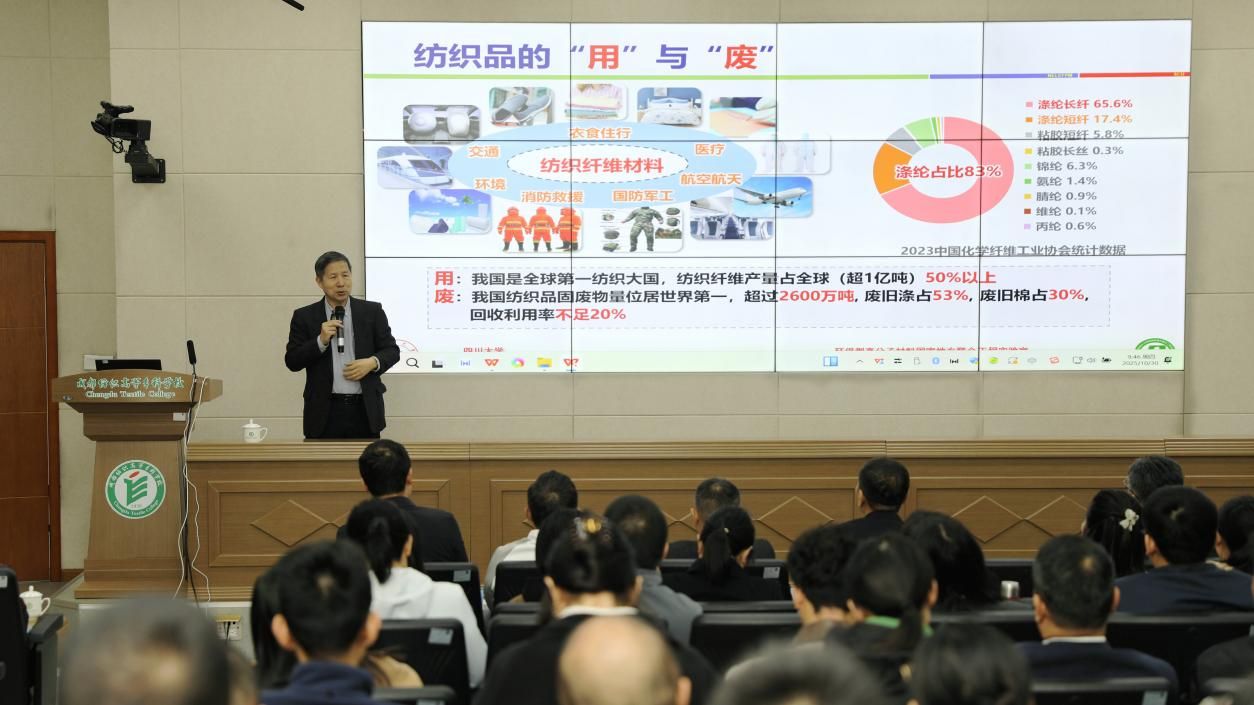 王玉忠院士以《废旧纺织品的循环与升级回收利用》为题,系统解析了全球纺织废弃物处理的痛点难点。其团队首创的物理-化学协同解聚技术,为涤纶等合成纤维的高值化再生开辟新路径。毛志平教授聚焦《绿色低碳印染技术》,从低温前处理、活性/分散染料高效染色等维度,展示印染环节减污降碳的创新突破。